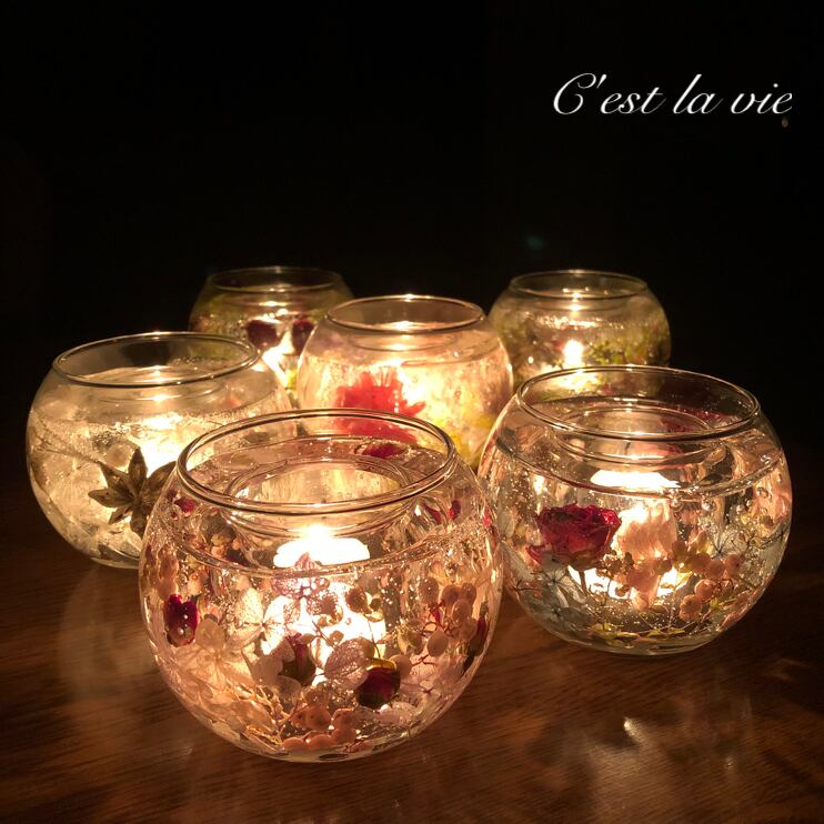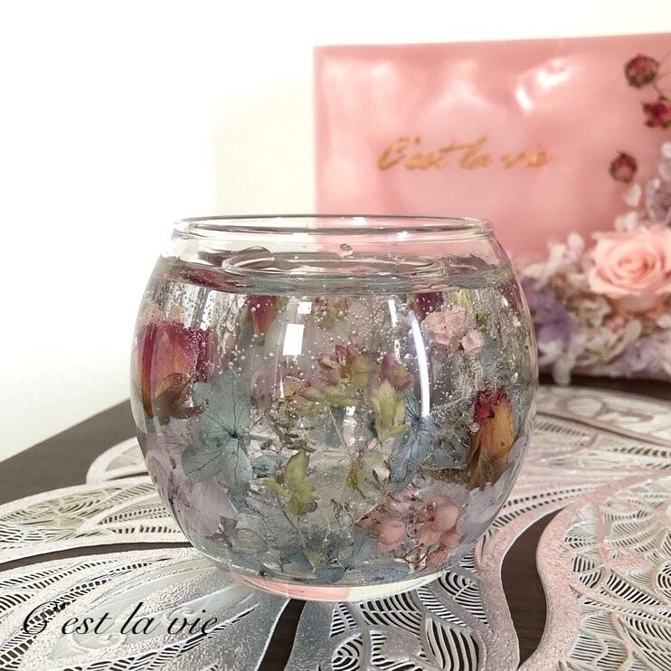 透明なジェルワックスの中にプリザーブドフラワーやドライフラワーなどを閉じ込めています。