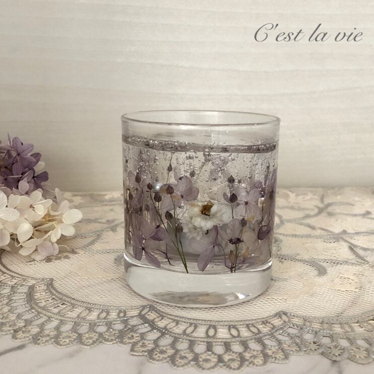 透明なジェルワックスの中にプリザーブドフラワーを閉じ込めています。