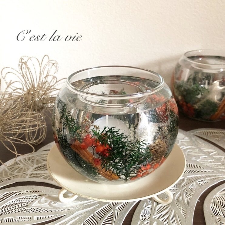 透明なジェルワックスの中にクリスマスをイメージしたプリザーブドフラワーや実ものなどを閉じ込め、デザイン致しました。