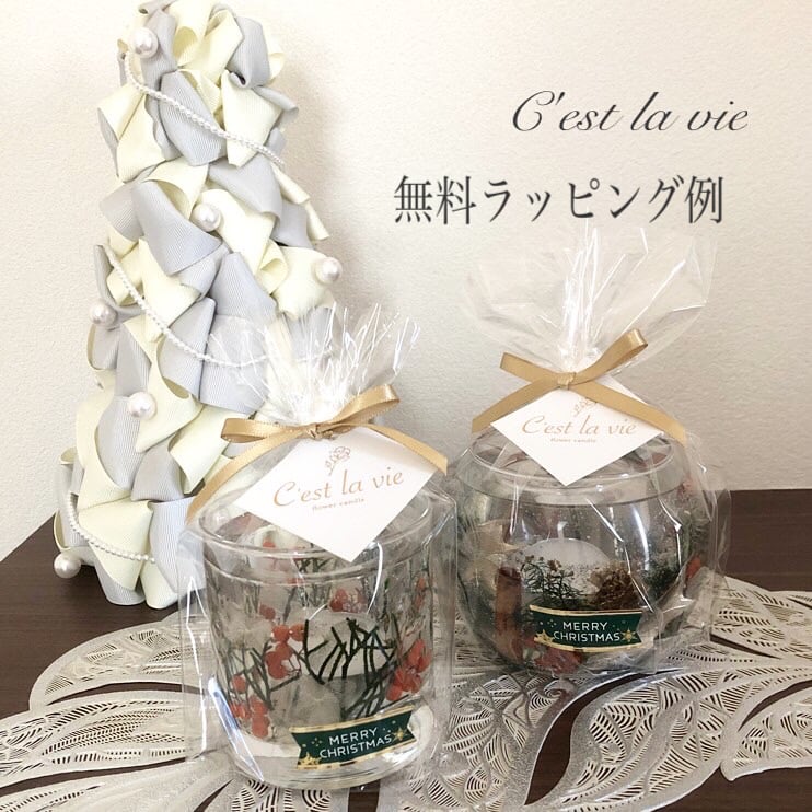 無料ラッピングは透明な袋にリボンとタグをおつけし、クリスマスシールを貼っています。(写真参照)